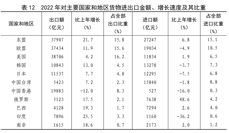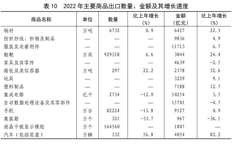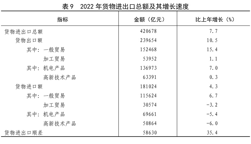 全年貨物進出口總額420678億元,比上年增長7.7%。其中,出口239654億元,增長10.5%;進口181024億元,增長4.3%。貨物進出口順差58630億元,比上年增加15330億元。對“一帶一路”[40]沿線國家進出口總額138339億元,比上年增長19.4%。其中,出口78877億元,增長20.0%;進口59461億元,增長18.7%。對《區(qū)域全面經(jīng)濟伙伴關(guān)系協(xié)定》(RCEP)其他成員國[41]進出口額129499億元,比上年增長7.5%。