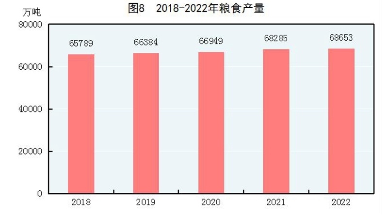 全年糧食產(chǎn)量68653萬噸,比上年增加368萬噸,增產(chǎn)0.5%。其中,夏糧產(chǎn)量14740萬噸,增產(chǎn)1.0%;早稻產(chǎn)量2812萬噸,增產(chǎn)0.4%;秋糧產(chǎn)量51100萬噸,增產(chǎn)0.4%。全年谷物產(chǎn)量63324萬噸,比上年增產(chǎn)0.1%。其中,稻谷產(chǎn)量20849萬噸,減產(chǎn)2.0%;小麥產(chǎn)量13772萬噸,增產(chǎn)0.6%;玉米產(chǎn)量27720萬噸,增產(chǎn)1.7%。大豆產(chǎn)量2028萬噸,增產(chǎn)23.7%。