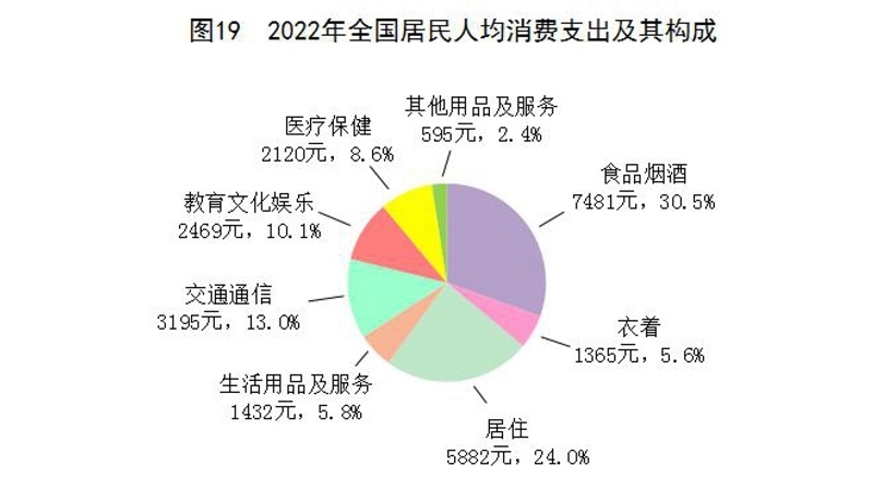 全年全國居民人均消費支出24538元,比上年增長1.8%,扣除價格因素,實際下降0.2%。其中,人均服務(wù)性消費支出[54]10590元,比上年下降0.5%,占居民人均消費支出的比重為43.2%。按常住地分,城鎮(zhèn)居民人均消費支出30391元,增長0.3%,扣除價格因素,實際下降1.7%;農(nóng)村居民人均消費支出16632元,增長4.5%,扣除價格因素,實際增長2.5%。全國居民恩格爾系數(shù)為30.5%,其中城鎮(zhèn)為29.5%,農(nóng)村為33.0%。