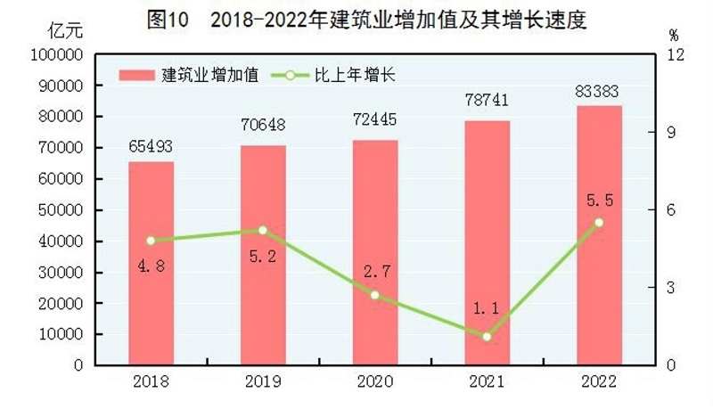 全年建筑業(yè)增加值83383億元,比上年增長5.5%。全國具有資質(zhì)等級的總承包和專業(yè)承包建筑業(yè)企業(yè)利潤8369億元,比上年下降1.2%,其中國有控股企業(yè)3922億元,增長8.4%。