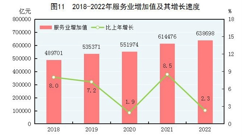 全年批發(fā)和零售業(yè)增加值114518億元,比上年增長0.9%;交通運輸、倉儲和郵政業(yè)增加值49674億元,下降0.8%;住宿和餐飲業(yè)增加值17855億元,下降2.3%;金融業(yè)增加值96811億元,增長5.6%;房地產(chǎn)業(yè)增加值73821億元,下降5.1%;信息傳輸、軟件和信息技術(shù)服務(wù)業(yè)增加值47934億元,增長9.1%;租賃和商務(wù)服務(wù)業(yè)增加值39153億元,增長3.4%。全年規(guī)模以上服務(wù)業(yè)企業(yè)營業(yè)收入比上年增長2.7%,利潤總額增長8.5%。