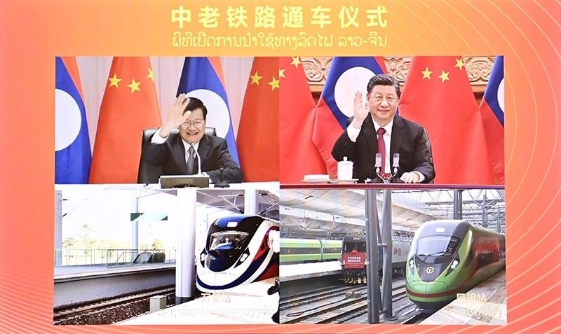 △2021年12月3日,中共中央總書記、國家主席習(xí)近平在北京同老撾人民革命黨中央總書記、國家主席通倫通過視頻連線共同出席中老鐵路通車儀式。