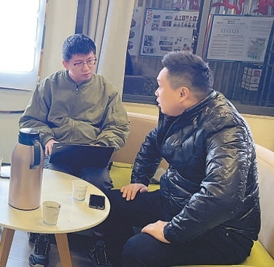 海南分社記者曹文軒(右)在海南省海口復興城互聯(lián)網(wǎng)信息產業(yè)園黨群服務中心采訪。張余雪攝