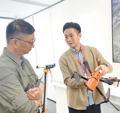 廣東分社記者李剛(左)在廣東省深圳市道通智能航空技術股份有限公司采訪。炎 琳攝