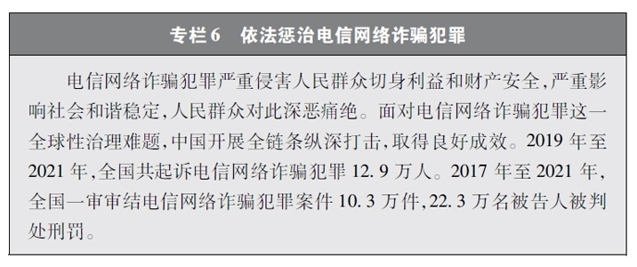加大網(wǎng)絡(luò)犯罪懲治力度。隨著互聯(lián)網(wǎng)技術(shù)的快速發(fā)展,傳統(tǒng)犯罪加速向以互聯(lián)網(wǎng)為媒介的非接觸式犯罪轉(zhuǎn)變,電信網(wǎng)絡(luò)詐騙、網(wǎng)絡(luò)賭博、網(wǎng)絡(luò)淫穢色情等涉網(wǎng)違法犯罪多發(fā)。中國依法辦理新型網(wǎng)絡(luò)犯罪案件。連續(xù)多年開展“凈網(wǎng)行動(dòng)”,嚴(yán)厲打擊群眾反映強(qiáng)烈的黑客攻擊破壞、侵犯公民個(gè)人信息等違法犯罪活動(dòng)。持續(xù)推進(jìn)“云劍”“斷卡”“斷流”“拔釘”等專項(xiàng)行動(dòng),打擊套路貸、校園貸、“以房養(yǎng)老”、“投資養(yǎng)老”等電信網(wǎng)絡(luò)詐騙犯罪,依法懲處為電信網(wǎng)絡(luò)詐騙犯罪團(tuán)伙提供互聯(lián)網(wǎng)接入、域名注冊、服務(wù)器托管、移動(dòng)互聯(lián)網(wǎng)應(yīng)用程序制作開發(fā)、網(wǎng)絡(luò)支付、引流推廣等服務(wù)支撐的黑灰產(chǎn)業(yè)。完善國家反詐大數(shù)據(jù)平臺(tái)和反詐移動(dòng)互聯(lián)網(wǎng)應(yīng)用程序,建設(shè)國家涉詐黑樣本庫,完善快速止付凍結(jié)機(jī)制、涉詐資金返還機(jī)制。堅(jiān)決打擊網(wǎng)絡(luò)賭博犯罪行為,從嚴(yán)治理網(wǎng)絡(luò)淫穢色情。網(wǎng)絡(luò)犯罪治理工作取得明顯成效,人民群眾安全感有效提升,社會(huì)更加和諧穩(wěn)定。