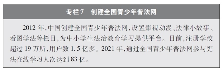 加強(qiáng)青少年網(wǎng)絡(luò)法治宣傳教育。青少年是祖國的未來、民族的希望。青少年網(wǎng)民在中國網(wǎng)民中的占比逐步增長。作為互聯(lián)網(wǎng)的“原住民”,青少年是網(wǎng)上學(xué)習(xí)、交流、生活最活躍的參與者、實(shí)踐者,其合法權(quán)益也更易受到網(wǎng)絡(luò)違法活動(dòng)的侵害。中國從保護(hù)青少年網(wǎng)絡(luò)權(quán)益,促進(jìn)青少年健康成長、全面發(fā)展出發(fā),遵循青少年身心發(fā)展規(guī)律,貼近青少年學(xué)習(xí)生活實(shí)際,聚焦網(wǎng)絡(luò)沉迷、網(wǎng)絡(luò)欺凌、網(wǎng)絡(luò)淫穢色情信息等重點(diǎn)問題,通過普法微綜藝、兒童普法話劇、網(wǎng)絡(luò)普法故事廣播、網(wǎng)絡(luò)普法云課堂、學(xué)法用法知識(shí)競賽、法治副校長進(jìn)校園、編寫網(wǎng)絡(luò)普法讀本等生動(dòng)活潑、豐富多彩的形式開展法治宣傳教育,逐步形成了政府、社會(huì)、學(xué)校、家庭相結(jié)合的法治宣傳教育格局,為提升青少年網(wǎng)民法治意識(shí)和網(wǎng)絡(luò)安全素養(yǎng)提供了全面保障。