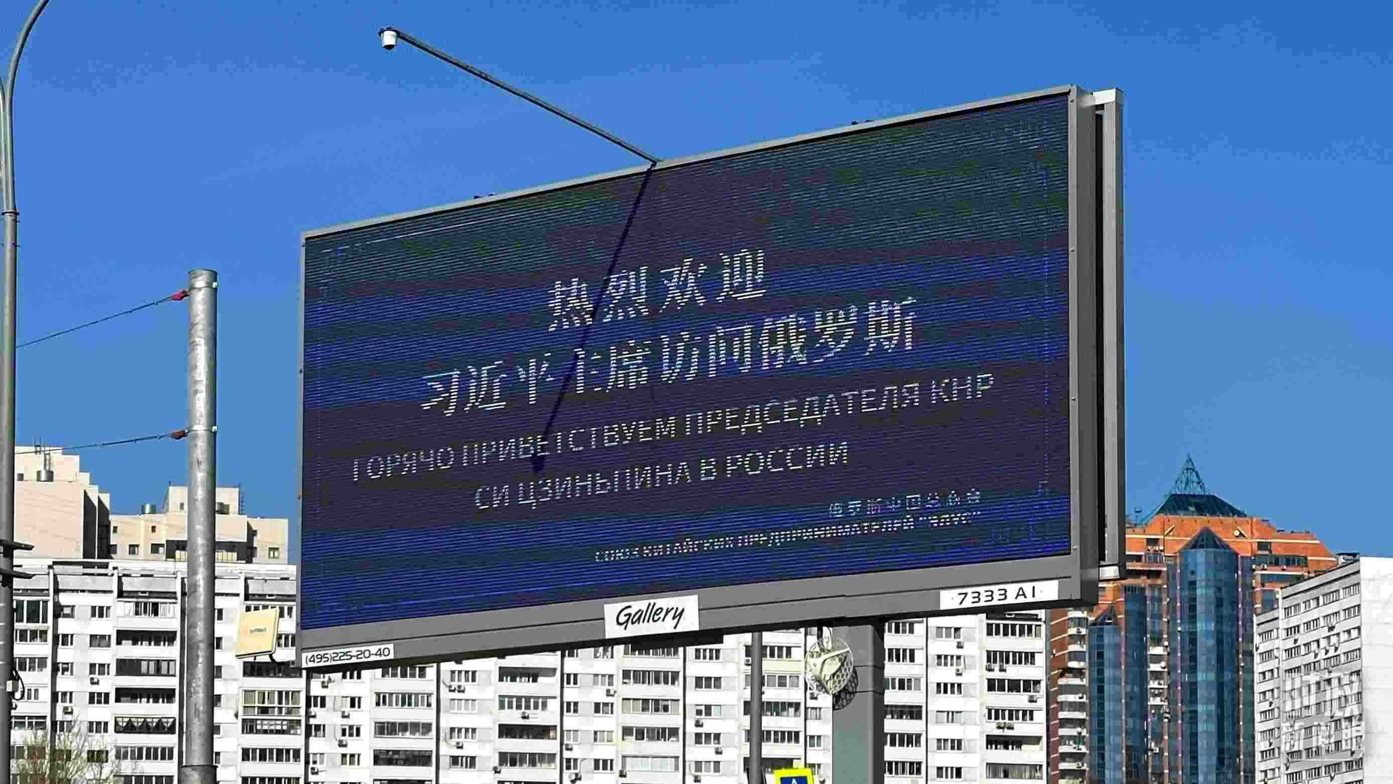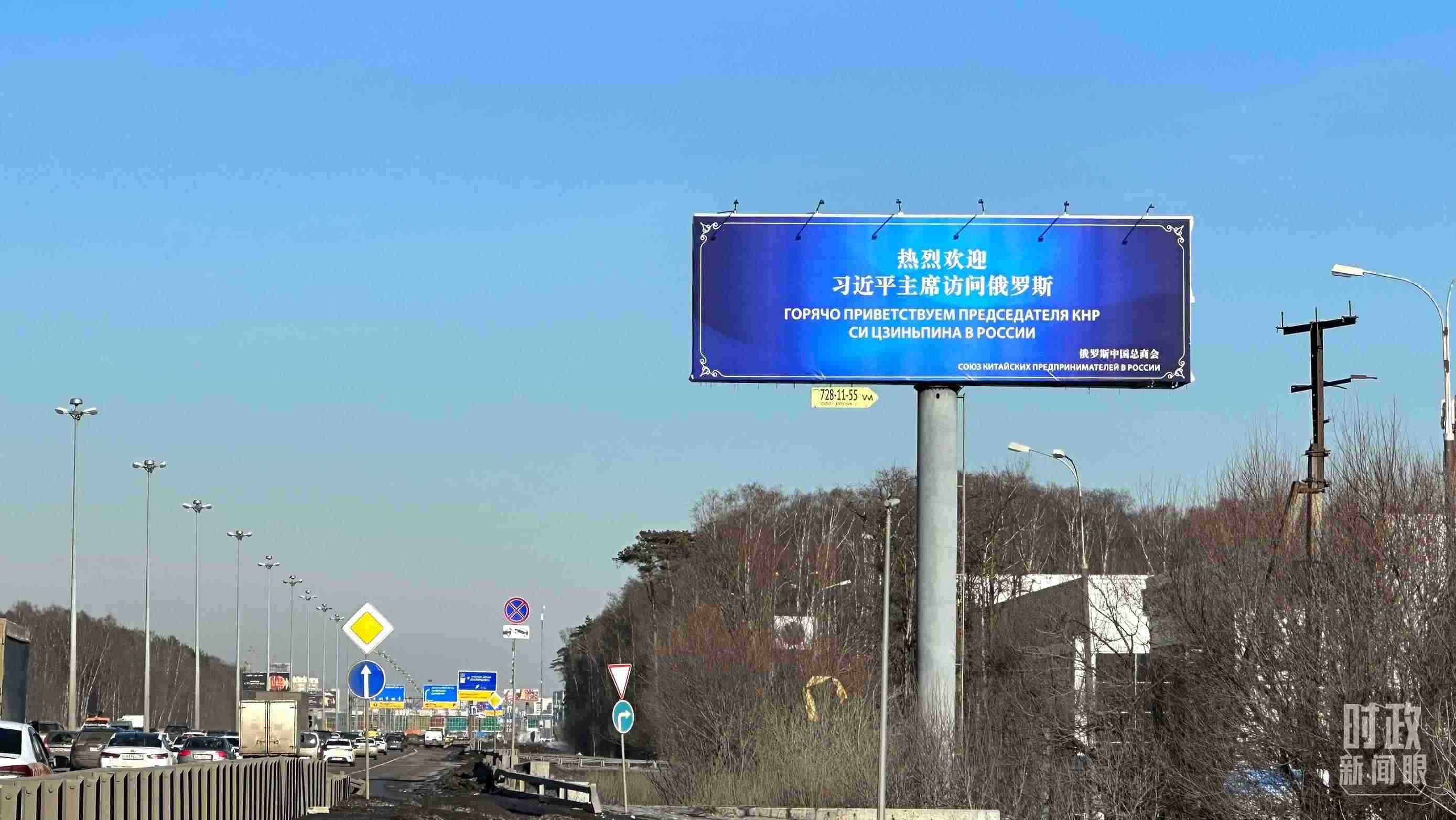 △莫斯科街頭,“熱烈歡迎習近平主席訪問俄羅斯”的歡迎標語。(總臺央視記者覃思拍攝)