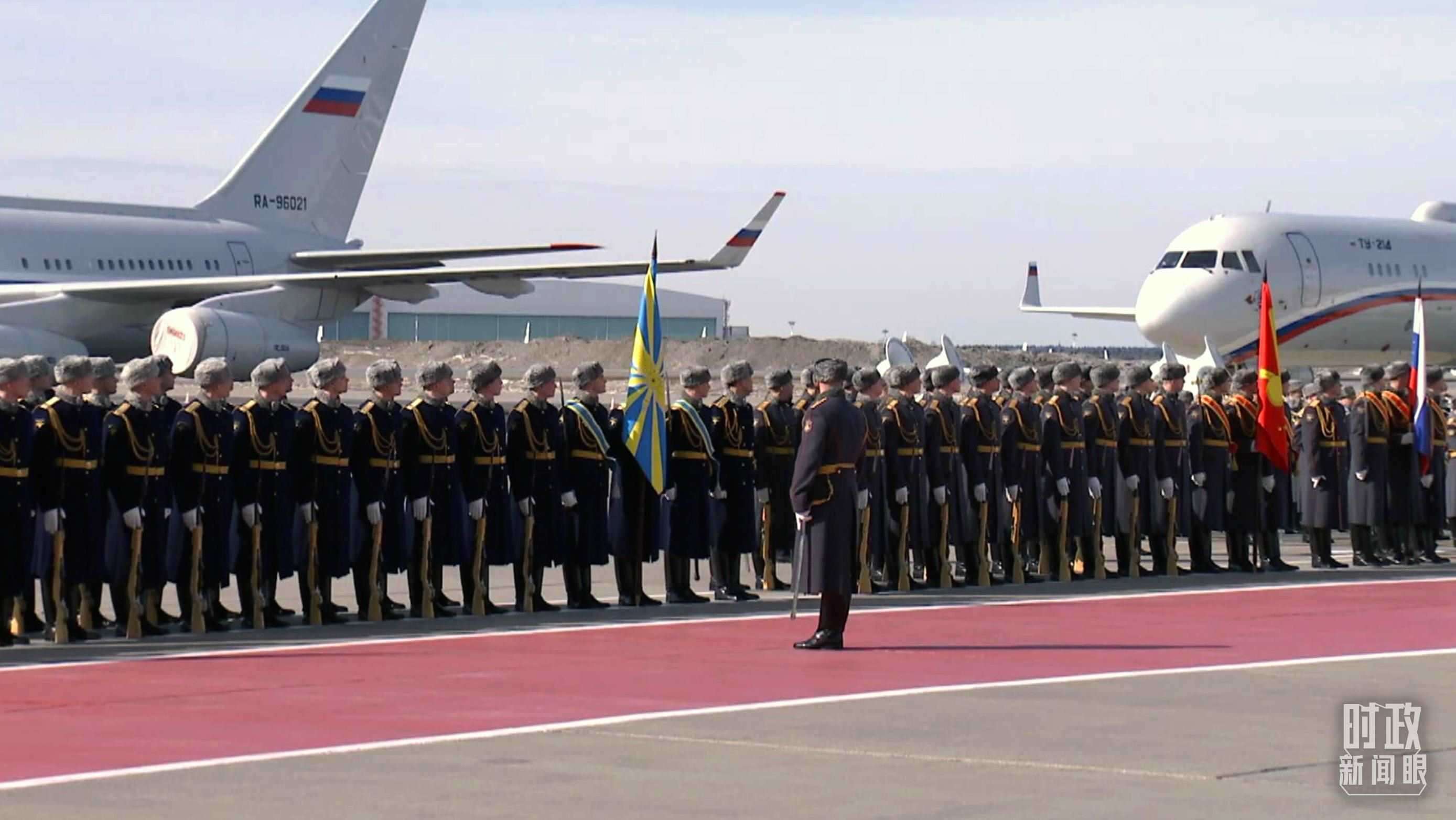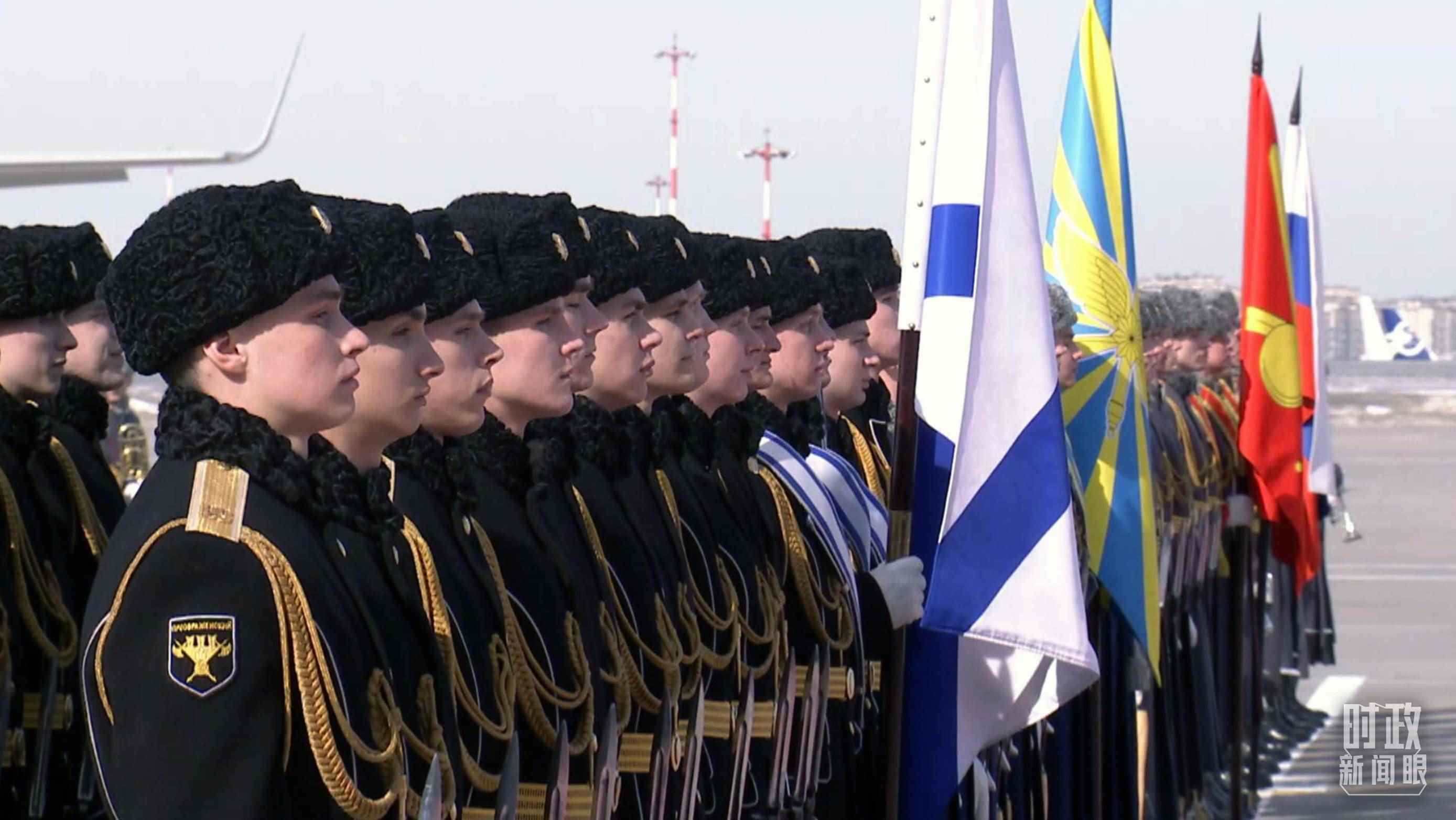 俄方在機場舉行隆重迎賓儀式。軍樂團奏中俄兩國國歌。習主席檢閱俄羅斯三軍儀仗隊并觀看分列式。