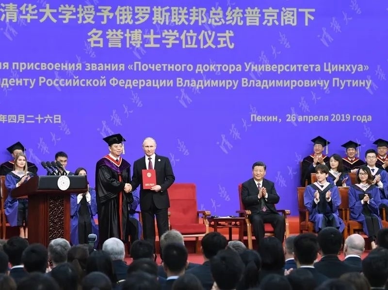 2019年4月,普京總統(tǒng)率團(tuán)來(lái)華,出席第二屆“一帶一路”國(guó)際合作高峰論壇。期間,在北京友誼賓館,中方還有一項(xiàng)特殊安排:清華大學(xué)向普京總統(tǒng)授予名譽(yù)博士學(xué)位。