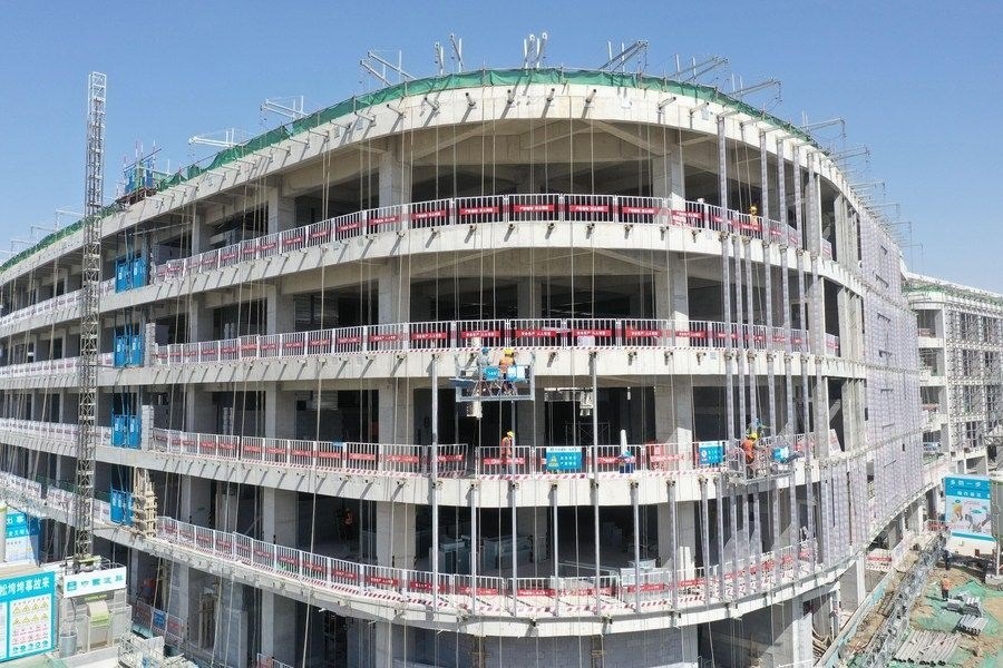 在雄安新區(qū)啟動(dòng)區(qū),工人在中國衛(wèi)星網(wǎng)絡(luò)集團(tuán)有限公司雄安總部施工現(xiàn)場(chǎng)作業(yè)(3月15日攝,無人機(jī)照片)。
