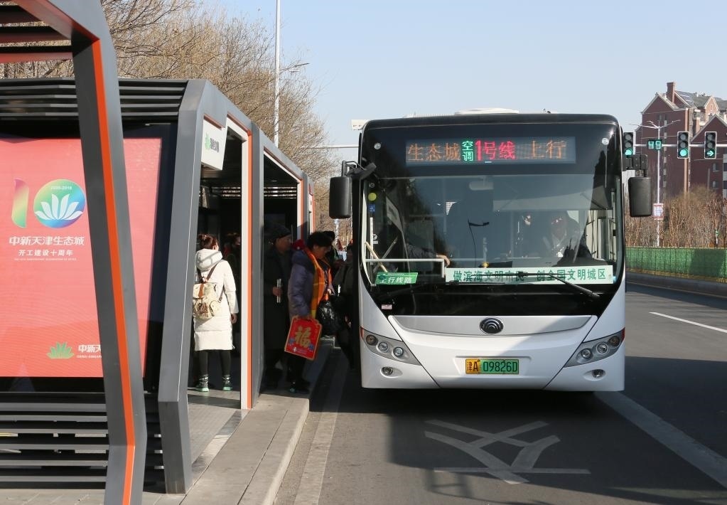 乘客在中新天津生態(tài)城的一座智慧公交站乘坐免費(fèi)的純電動(dòng)公交車(chē)。