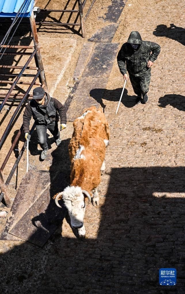 4月12日,賣(mài)家在成峰牲畜交易市場(chǎng)趕牛。