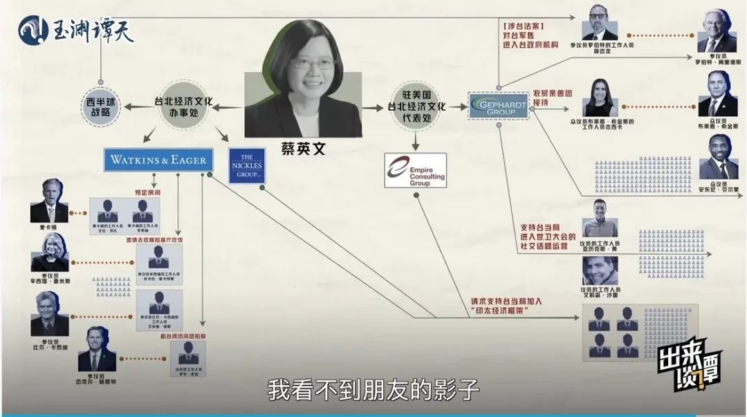 趁熱再打鐵,玉淵譚天繼續(xù)抽絲剝繭,以數(shù)據(jù)視頻《起底!臺當局“朋友圈”大公開》深扒臺當局近兩年在美國登記在冊的游說方式與對象,用翔實的數(shù)據(jù),揭秘了臺當局能接觸到的美國會人員多為邊緣人的真相,結(jié)合送“保護費”、送“官職”等賣臺行為實錘,讓臺當局在所謂“美臺關(guān)系”中的卑微姿態(tài)展露無遺。