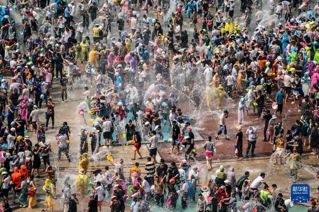 4月15日,人們在云南省西雙版納傣族自治州景洪市潑水廣場潑水狂歡。