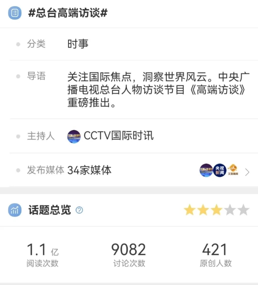 在充分調(diào)研的基礎(chǔ)上,《高端訪談》的采訪敢于碰真問題、硬問題,緊扣當(dāng)下熱點(diǎn),以觀點(diǎn)鮮明、針對(duì)性強(qiáng)、易于傳播的重磅采訪報(bào)道主動(dòng)設(shè)置議題,奮力提升中國(guó)聲音在國(guó)際輿論場(chǎng)中的話語(yǔ)權(quán)。