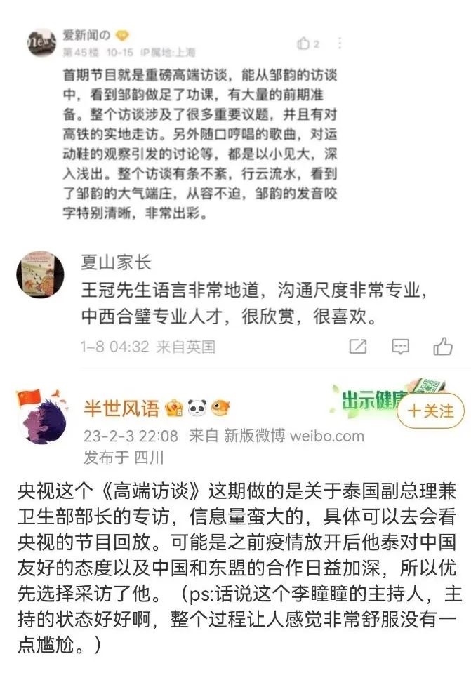 人之相識(shí),貴在相知;人之相知,貴在知心。“知心”是交流對(duì)話、建立友誼的最高境界,對(duì)于人物訪談來(lái)說(shuō)更是如此。鄒韻、王冠、李曈曈三位總臺(tái)主持人的采訪邏輯嚴(yán)密、自信從容、靈動(dòng)活潑,善于從直擊人心的關(guān)鍵點(diǎn)發(fā)問,控場(chǎng)張弛有度,彰顯《高端訪談》的國(guó)際視野和中國(guó)風(fēng)范,獲得海內(nèi)外廣泛關(guān)注。