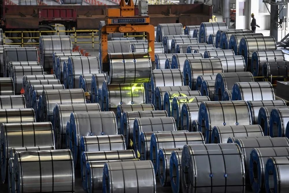 4月19日,在河北雙灤一家釩鈦新材料企業(yè)冷軋產(chǎn)品車間,工人在吊裝冷軋鍍鋅板。新華社發(fā)(王立群 攝)