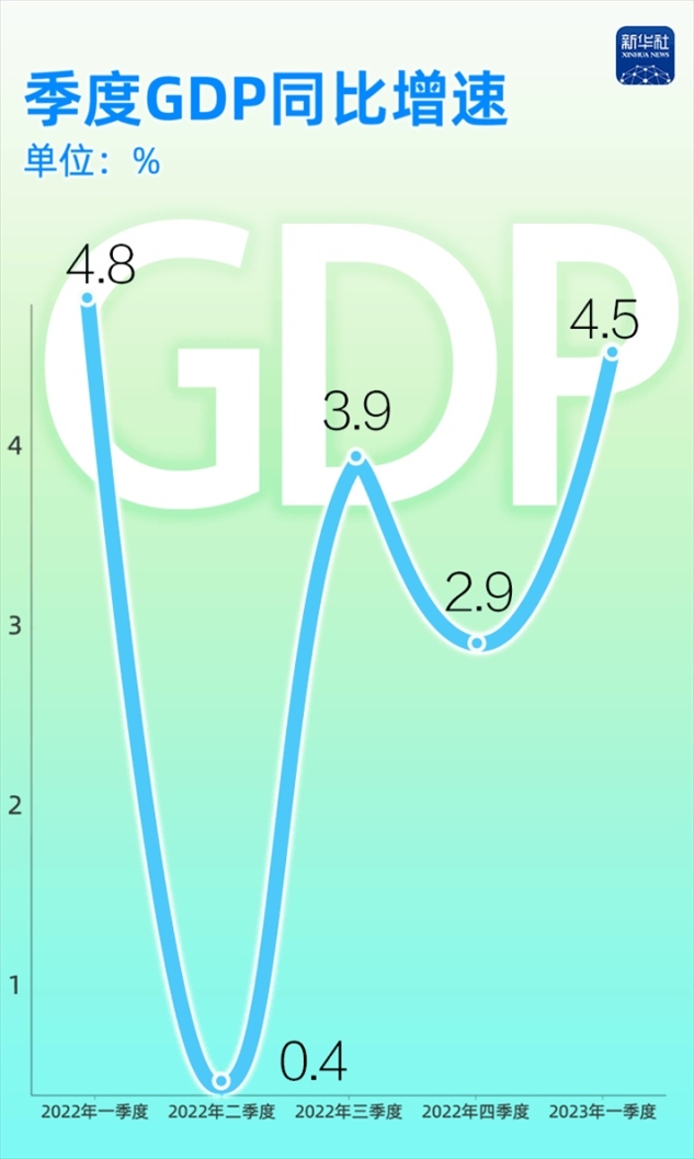 有數(shù)為證:2022年至今,我國的季度GDP同比增速分別為4.8%、0.4%、3.9%、2.9%和4.5%,一季度GDP增速達到了2022年二季度以來最高水平。