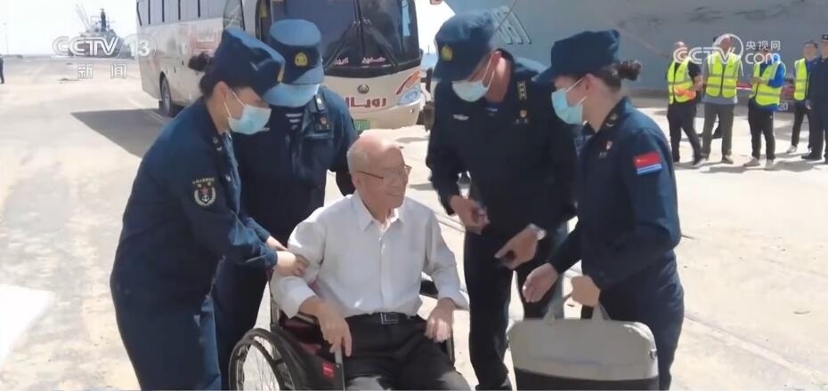 84歲的蘇丹華僑張緒富腿腳不便,接到大使館通知后,微山湖艦官兵提前準(zhǔn)備好了輪椅。張老抵達(dá)碼頭后,官兵們用輪椅推著張老登記、安檢后,攙扶著他登上軍艦。