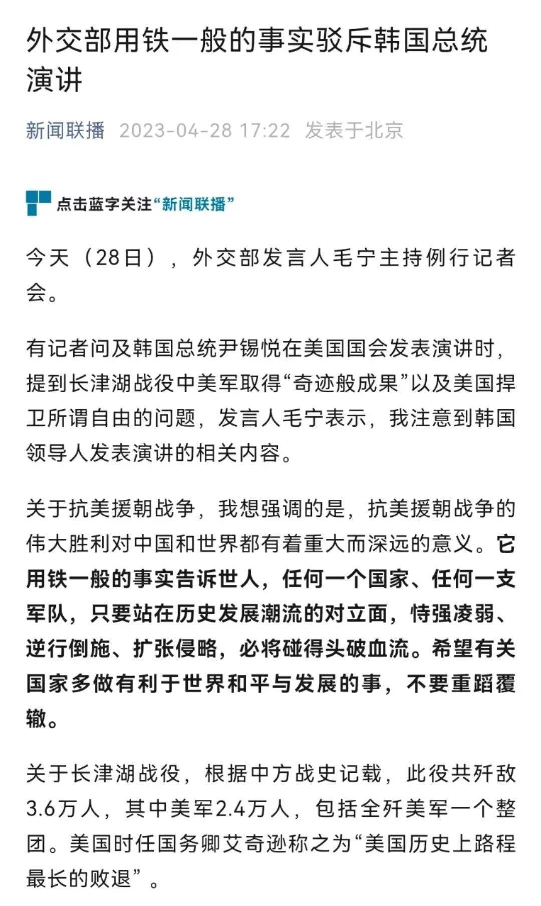根據(jù)外媒報道,韓國總統(tǒng)4月27日在美國國會發(fā)表演講稱,美國海軍陸戰(zhàn)隊第一師在長津湖戰(zhàn)役中取得了所謂的“奇跡般成果”。
