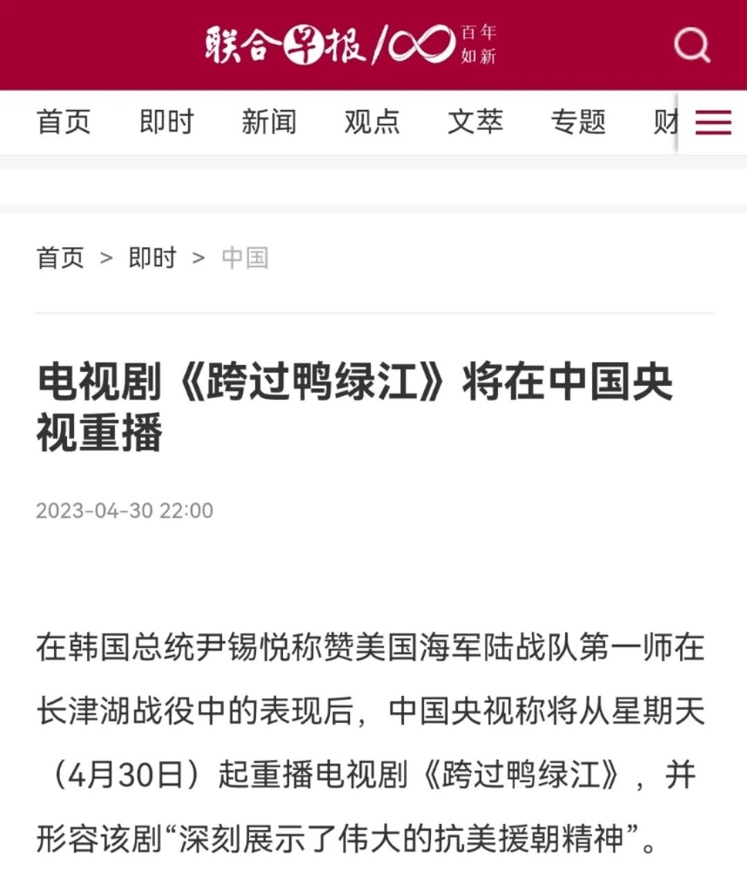 新加坡《聯(lián)合早報》更在4月30日晚10點準(zhǔn)時發(fā)布文章《電視劇<跨過鴨綠江>將在中國央視重播》,開篇明確重點:在韓國總統(tǒng)稱贊美國海軍陸戰(zhàn)隊第一師在長津湖戰(zhàn)役中的表現(xiàn)后,中國央視稱將從星期天(4月30日)起重播電視劇《跨過鴨綠江》。