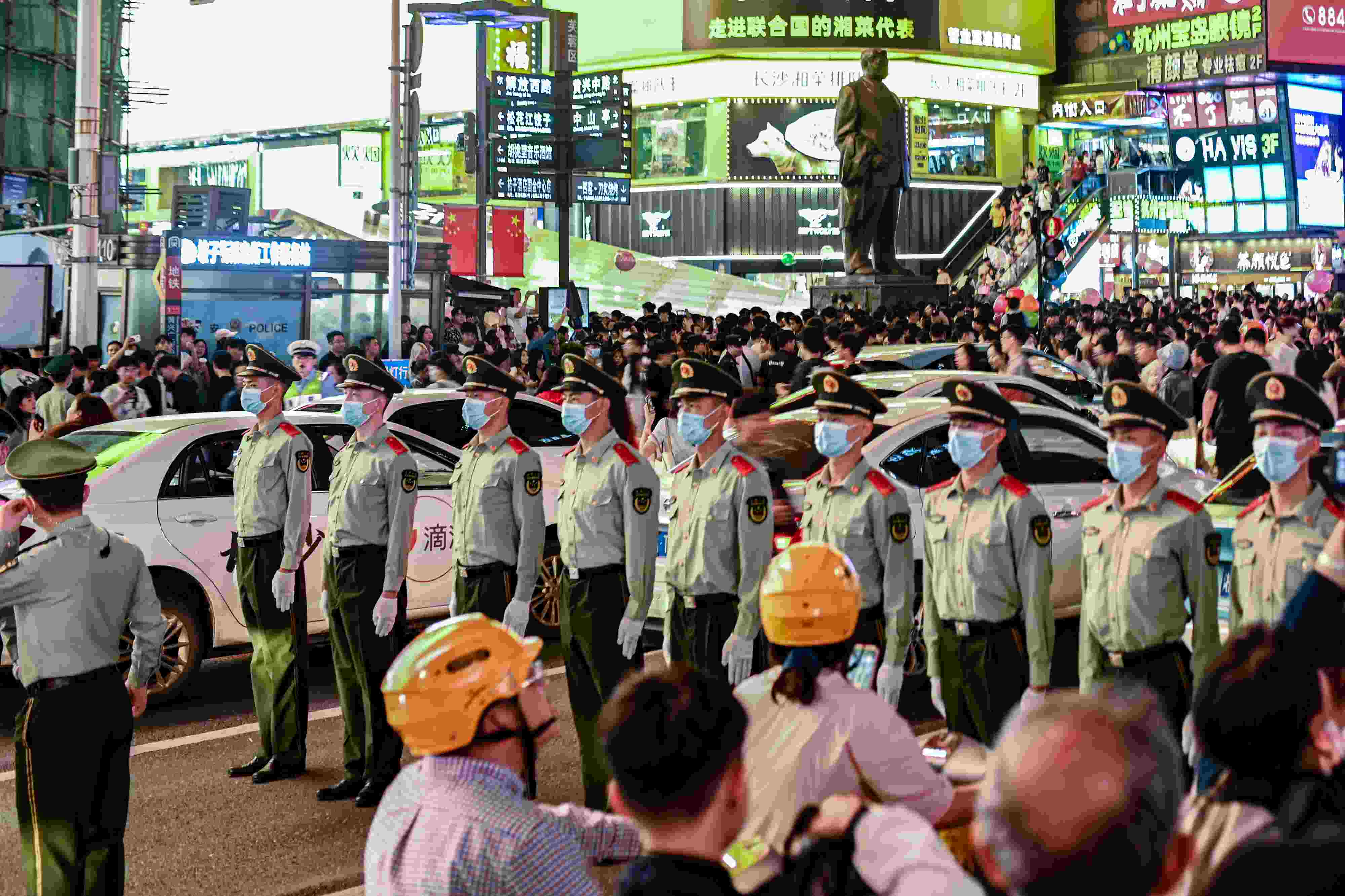 2023年5月1日,長(zhǎng)沙,“五一”小長(zhǎng)假,五一商圈成為眾多游客必到打卡地,為了保障人民群眾的安全,武警長(zhǎng)沙支隊(duì)官兵同長(zhǎng)沙公安民警一道,在市中心解放西路與黃興中路的十字路口,筑起“人墻”,守護(hù)行人安全通行。 視覺(jué)中國(guó)