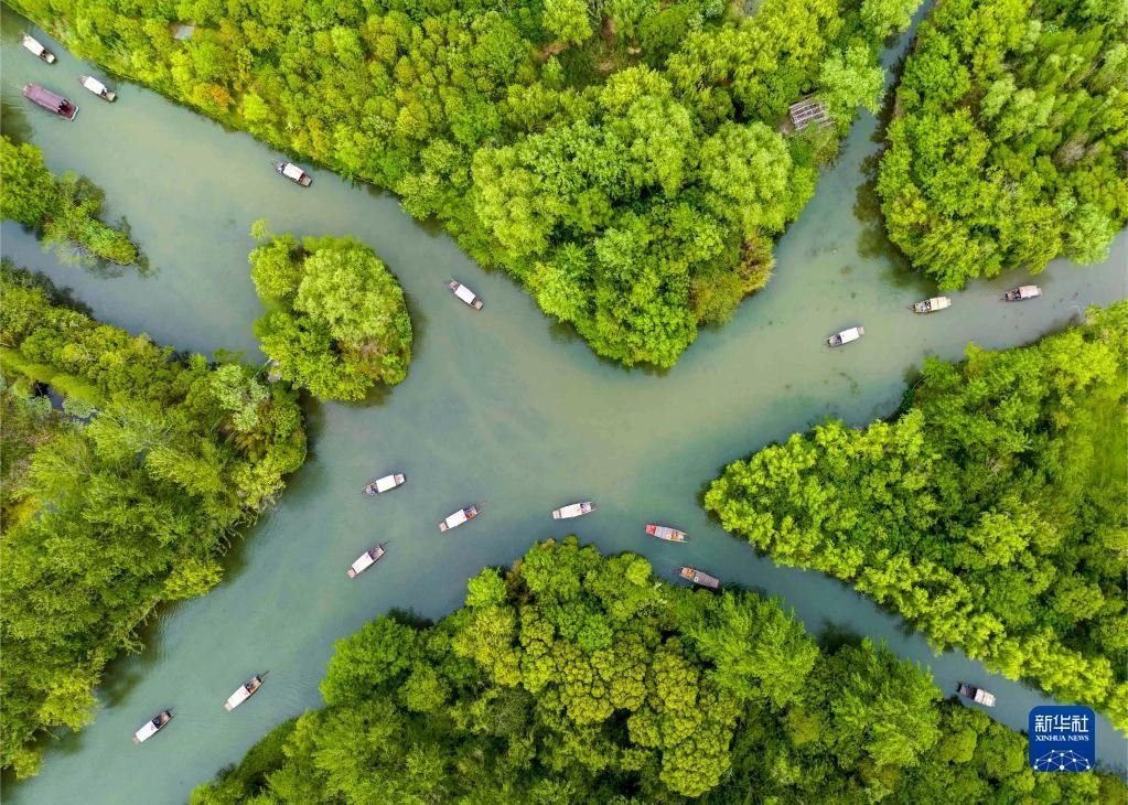 5月2日,游客在江蘇省泰州市姜堰區(qū)溱湖國家濕地公園內(nèi)乘坐搖櫓船游玩(無人機(jī)照片)。
