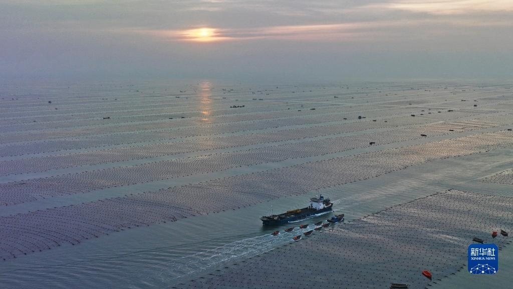 5月2日,在山東省榮成市愛倫灣海洋牧場,收獲海帶的養(yǎng)殖船和運(yùn)輸鮑魚的運(yùn)鮮船在養(yǎng)殖區(qū)穿梭(無人機(jī)照片)。