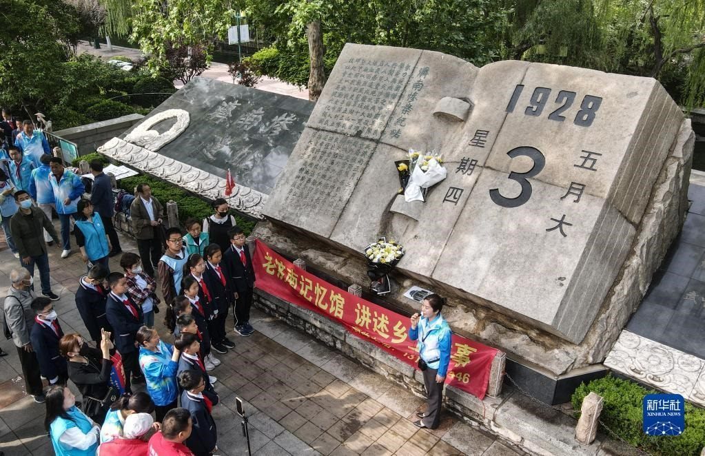 5月3日,小學(xué)生在“五三慘案”紀(jì)念碑前悼念。