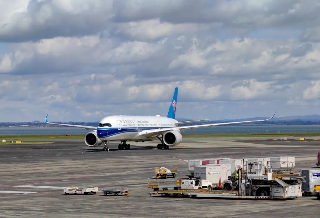 3月3日,搭載中國團(tuán)隊(duì)游客的中國南方航空公司班機(jī)抵達(dá)新西蘭奧克蘭國際機(jī)場。新華社發(fā)(程麒麟 攝)