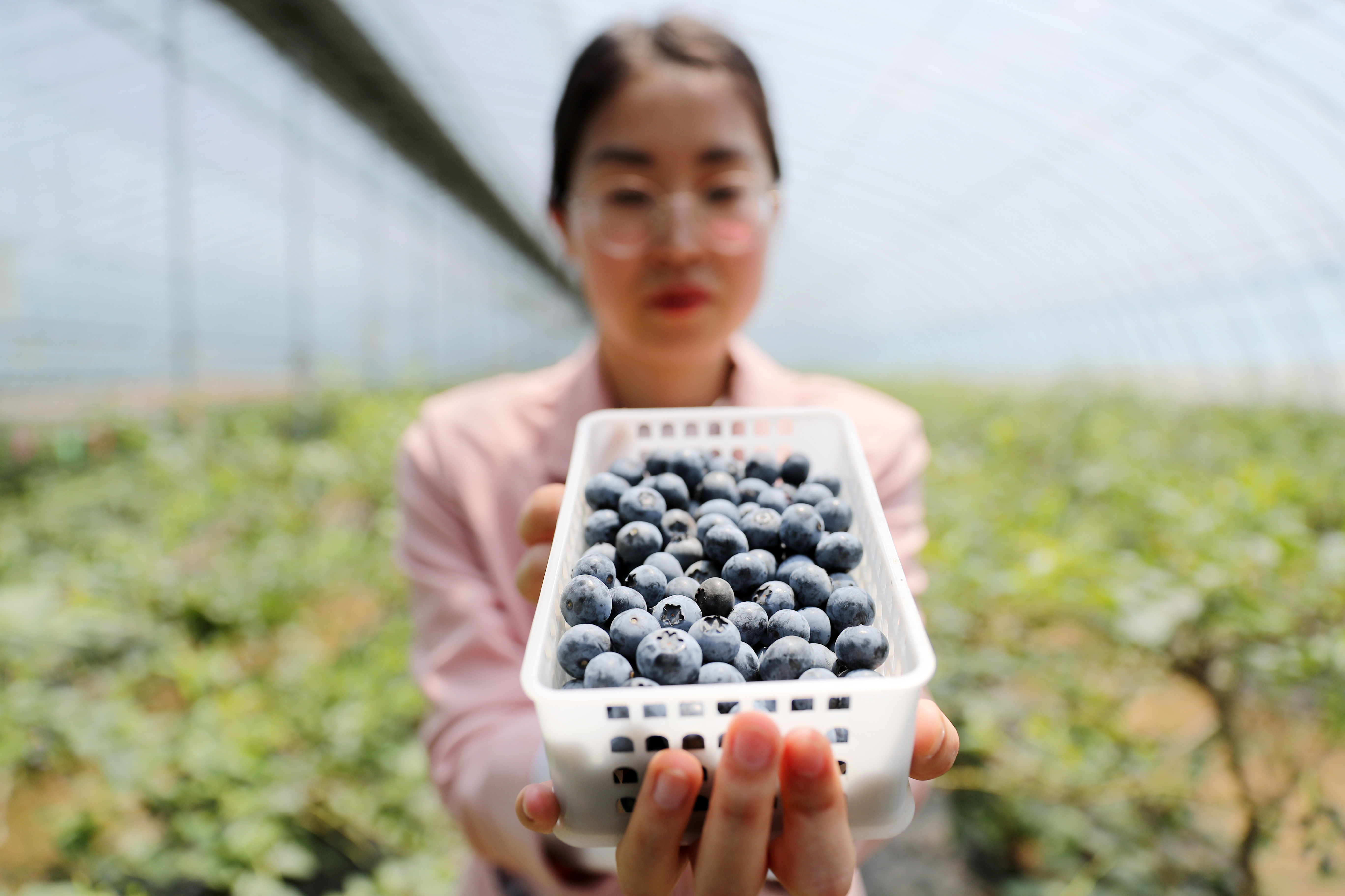 5月7日,青島西海岸新區(qū)寶山鎮(zhèn)一種植戶在分裝藍(lán)莓。