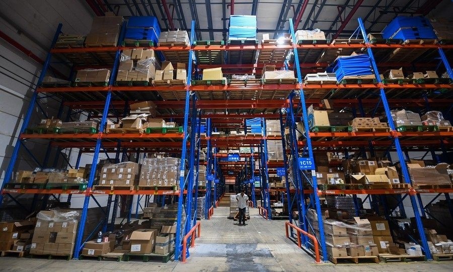 2022年9月2日,在杭州綜合保稅區(qū)一家跨境保稅倉(cāng)內(nèi),工作人員在搬運(yùn)跨境電商保稅進(jìn)口商品。新華社記者 徐昱 攝