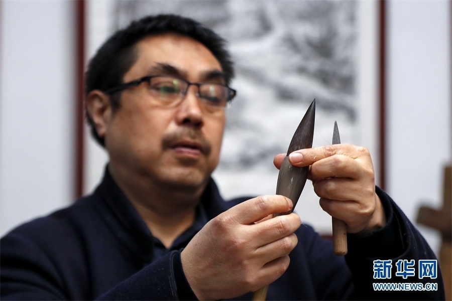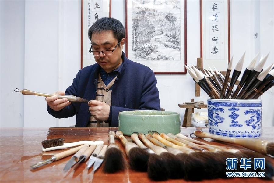 一支好的徽筆,不僅要保留傳統(tǒng)工藝,且要在原基礎(chǔ)上不斷創(chuàng)新、改良。楊文尤其重視書畫家對筆的使用反饋:“因?yàn)樗麄儗τ霉P最挑剔,而且現(xiàn)代書畫家創(chuàng)作方式和作品不斷創(chuàng)新,對毛筆也有新的要求,他們提出的要求我總是盡力去滿足,也使得制筆技藝進(jìn)一步得到了提高?!? 新華網(wǎng)發(fā)(施亞磊 攝)
