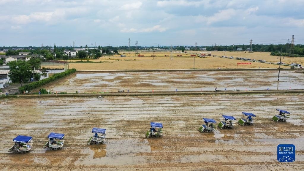 5月10日,在四川省崇州市天府糧倉國家現(xiàn)代農(nóng)業(yè)園區(qū),農(nóng)民駕駛農(nóng)機(jī)搶種水稻(無人機(jī)照片)。