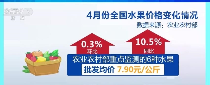 數(shù)據(jù)顯示,4月份,農業(yè)農村部重點監(jiān)測的6種水果批發(fā)均價每公斤7.90元,環(huán)比上漲0.3%,同比上漲10.5%。5月份以后,隨著天氣轉暖,南方的西瓜、甜瓜和華北、華中產區(qū)的櫻桃、草莓、桑葚等時令鮮果陸續(xù)進入收獲期,水果市場供應量和品種齊增。