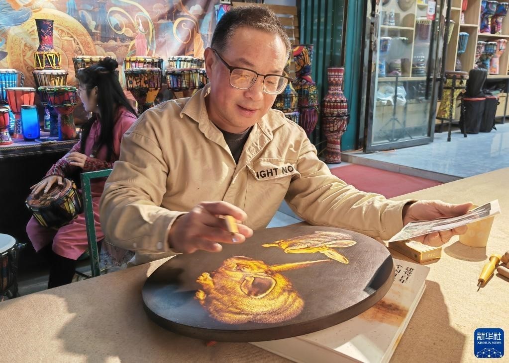 5月10日,工藝美術(shù)師申洪杰在敦煌夜市進行敦煌木刻畫創(chuàng)作展示(手機照片)。