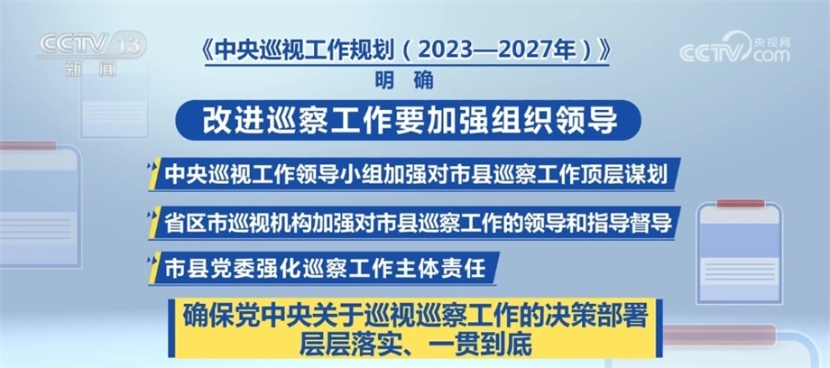 《中央巡視工作規(guī)劃(2023—2027年)》明確,改進(jìn)巡察工作要加強(qiáng)組織領(lǐng)導(dǎo)。中央巡視工作領(lǐng)導(dǎo)小組加強(qiáng)對市縣巡察工作頂層謀劃,省區(qū)市巡視機(jī)構(gòu)加強(qiáng)對市縣巡察工作的領(lǐng)導(dǎo)和指導(dǎo)督導(dǎo),市縣黨委強(qiáng)化巡察工作主體責(zé)任,確保黨中央關(guān)于巡視巡察工作的決策部署層層落實、一貫到底。