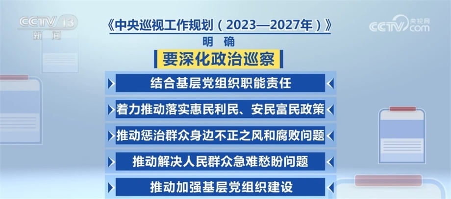 央視網(wǎng)消息:近日,經(jīng)黨中央同意,中共中央辦公廳印發(fā)了《中央巡視工作規(guī)劃(2023—2027年)》,對今后5年的巡視工作作出了部署。一屆任期內(nèi)實現(xiàn)巡視全覆蓋,是黨章規(guī)定的政治任務(wù)。通過什么樣的方式實現(xiàn)二十屆中央巡視全覆蓋?采取哪些措施高質(zhì)量推進(jìn)巡視全覆蓋?在此次印發(fā)的巡視工作規(guī)劃中都作出了要求。