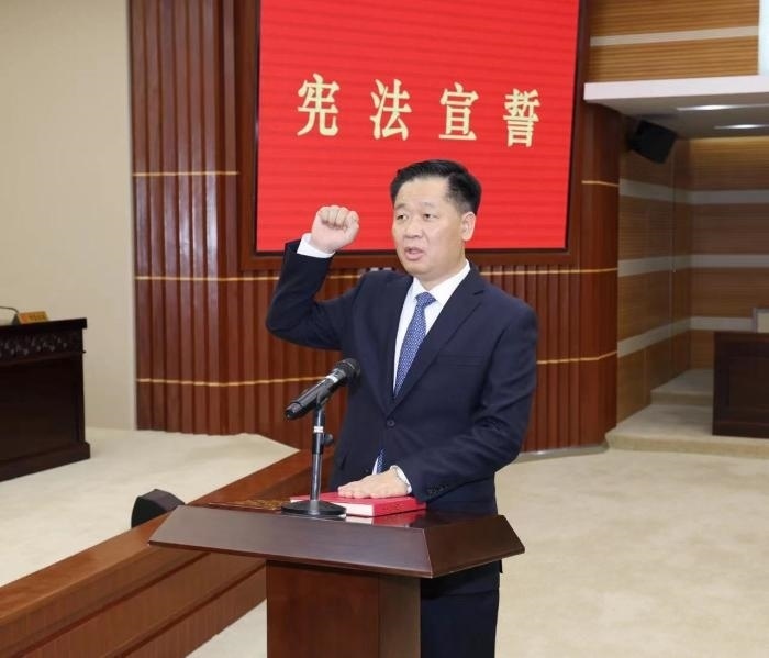 潘國(guó)強(qiáng)進(jìn)行憲法宣誓 圖片來(lái)源:微信公眾號(hào)“揚(yáng)州發(fā)布”