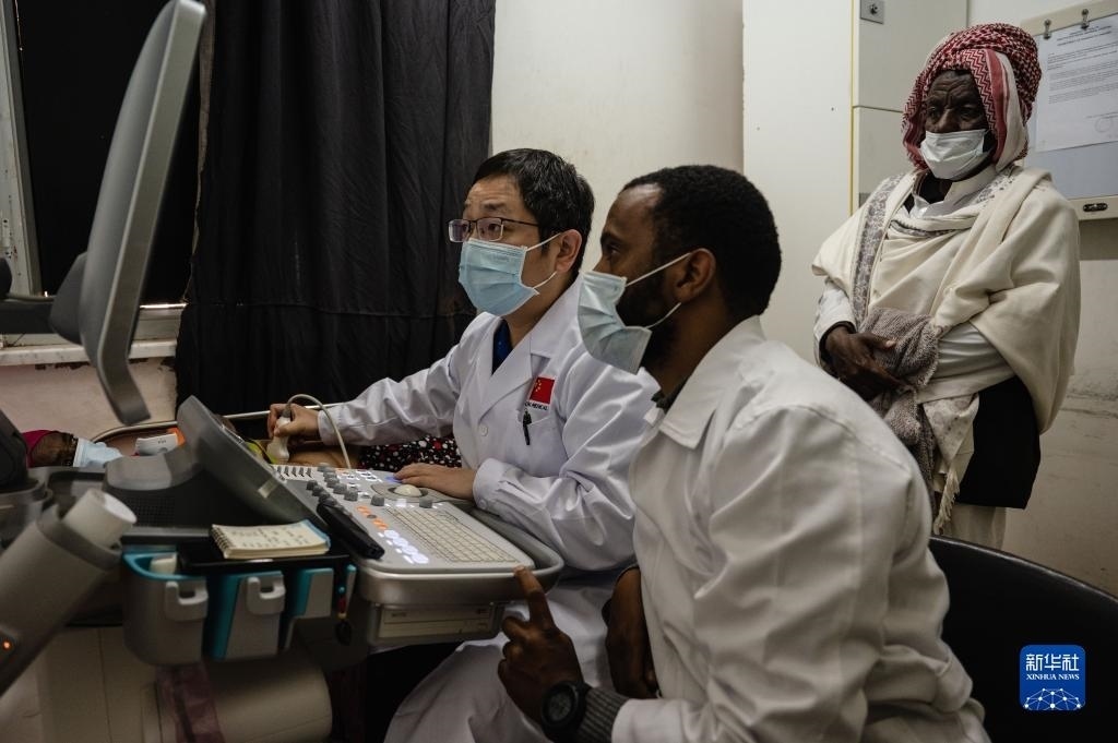 5月9日,在厄立特里亞首都阿斯馬拉的奧羅特醫(yī)院,醫(yī)療隊超聲科醫(yī)生王曉(左)為患者做檢查。