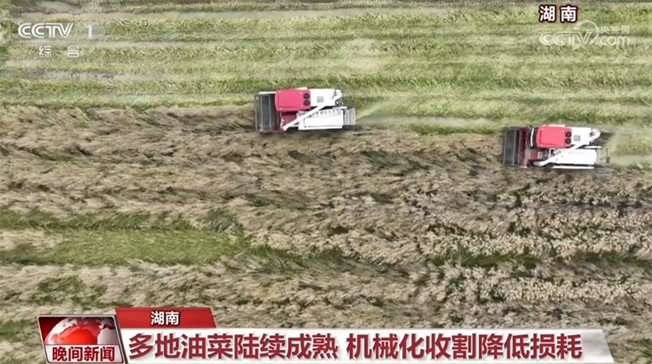 近日,湖南多地的油菜陸續(xù)進(jìn)入采收期。在衡陽市衡陽縣,種植戶凌超駕駛著新型聯(lián)合收割機(jī)在田間作業(yè)。伴隨著機(jī)器的轟鳴聲,一茬茬油菜被送到機(jī)器中,油菜籽和秸稈被直接分離,打碎的秸稈從機(jī)器尾部噴撒還田。凌超告訴記者,通過全程機(jī)械化作業(yè),不僅縮短了工時(shí),還節(jié)約了成本。