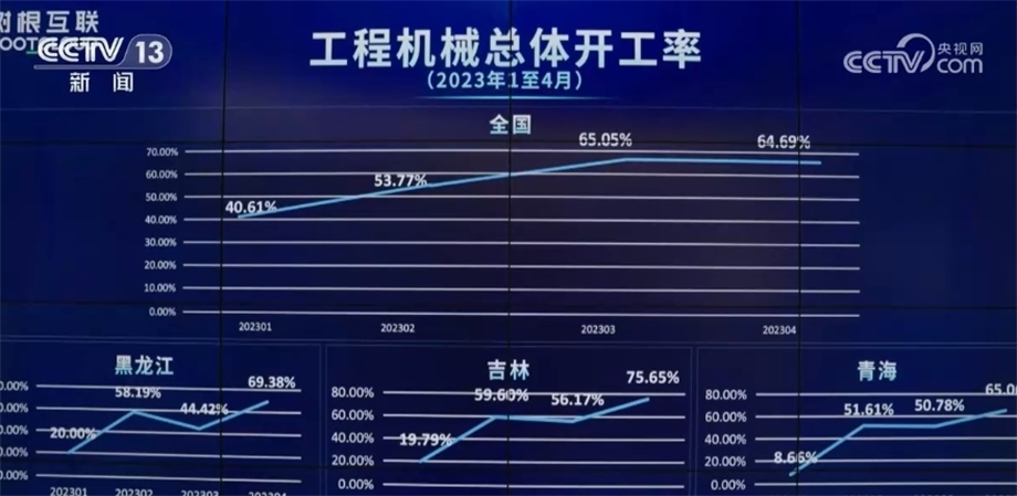 這個大屏幕反映的是全國挖掘機的開工情況,相關(guān)負責(zé)人告訴記者,“挖掘機指數(shù)”顯示出今年我國工程機械行業(yè)開始出現(xiàn)回暖跡象。4月份,全國工程機械總體開工率為64.69%,環(huán)比3月基本持平。12個省(區(qū)、市)創(chuàng)下今年以來最好成績。