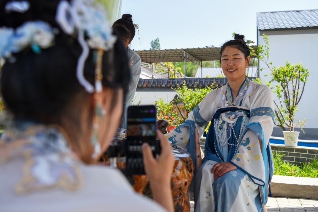 在新疆伊犁哈薩克自治州霍城縣大西溝鄉(xiāng)桃花村,游客穿著漢服在一家民宿內拍攝短視頻(5月17日攝)。新華社記者丁磊 攝