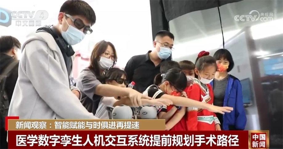 展會上,科研人員設(shè)計了一套基于全息現(xiàn)實的醫(yī)學(xué)數(shù)字孿生人機交互系統(tǒng),通過對患者數(shù)據(jù)進行建模,在投影的孿生人上生成血管、器官等重要組織結(jié)構(gòu),輔助醫(yī)生進行手術(shù)的路徑規(guī)劃。