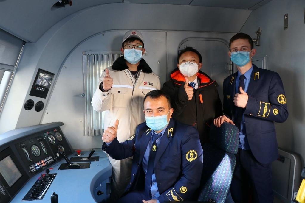 這是中國(guó)電力機(jī)車出口烏茲別克斯坦,中方技術(shù)人員和烏方駕駛?cè)藛T的合影。