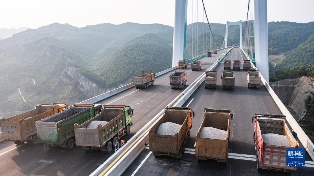 當(dāng)日,由貴州路橋集團承建的金烽烏江大橋進行靜態(tài)荷載試驗,48輛負(fù)載砂石的大型貨車有序行駛到固定的位置進行對稱、偏心檢測,檢驗橋梁結(jié)構(gòu)整體的施工質(zhì)量與受力性能,為橋梁竣工驗收提供科學(xué)依據(jù)。