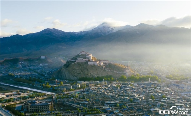 2023年5月22日,西藏日喀則,晨曦灑向江孜宗山古堡。