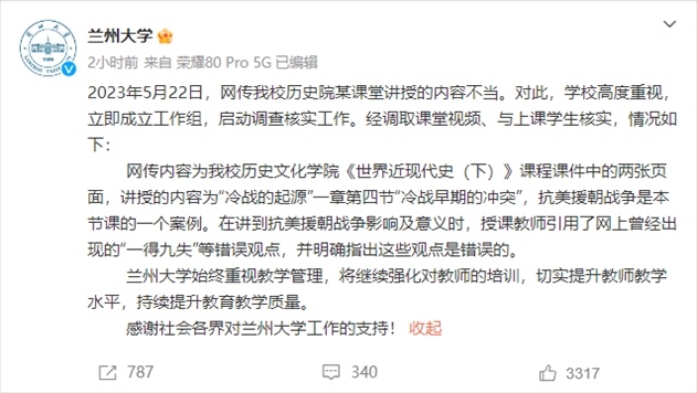 ·蘭州大學(xué)回應(yīng)教師課堂上“歪曲歷史”:教師引用網(wǎng)上曾經(jīng)出現(xiàn)的錯誤觀點,并指出這些觀點是錯誤的。