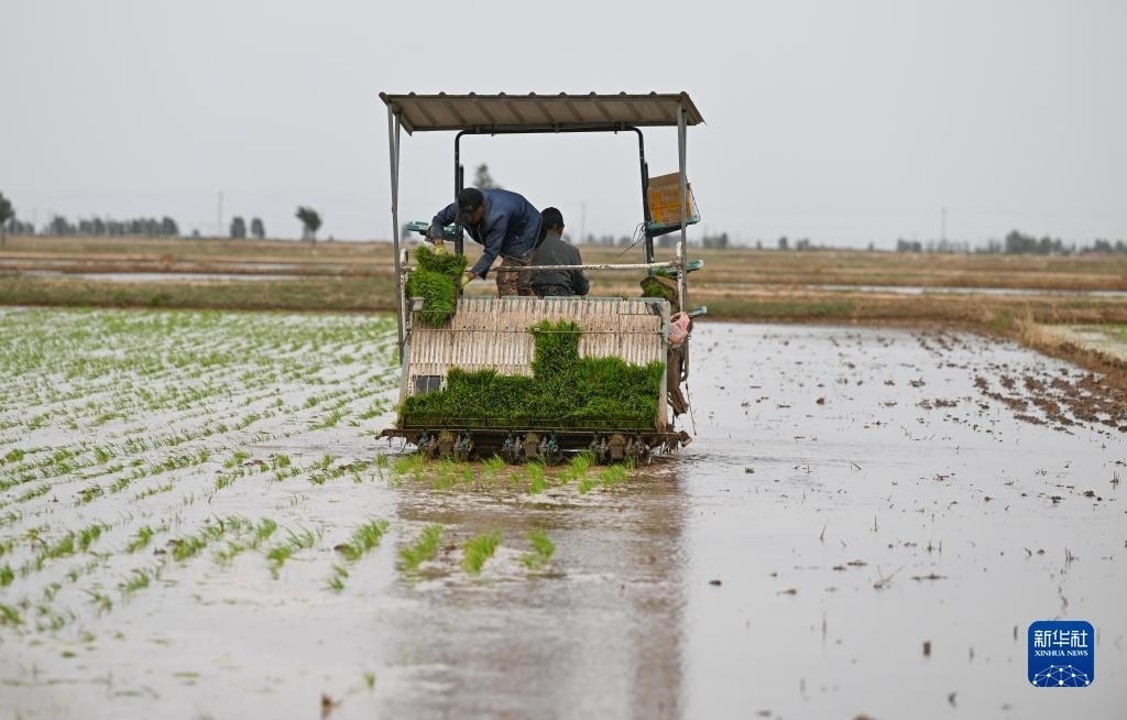 5月23日,達拉特旗昭君鎮(zhèn)村民在鹽堿地改良水稻田中使用農機插秧。