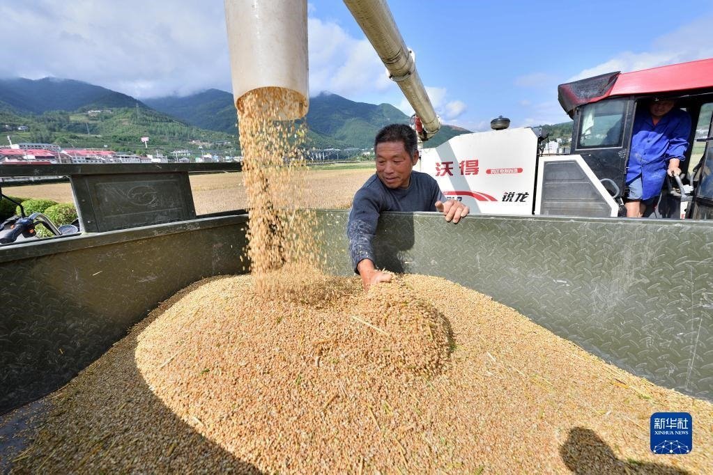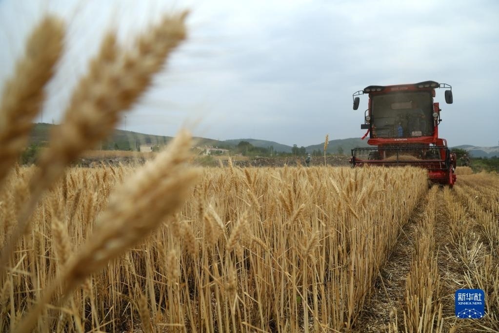 5月24日,收割機(jī)在山東省棗莊市山亭區(qū)鳧城鎮(zhèn)文王峪村田間收割小麥。